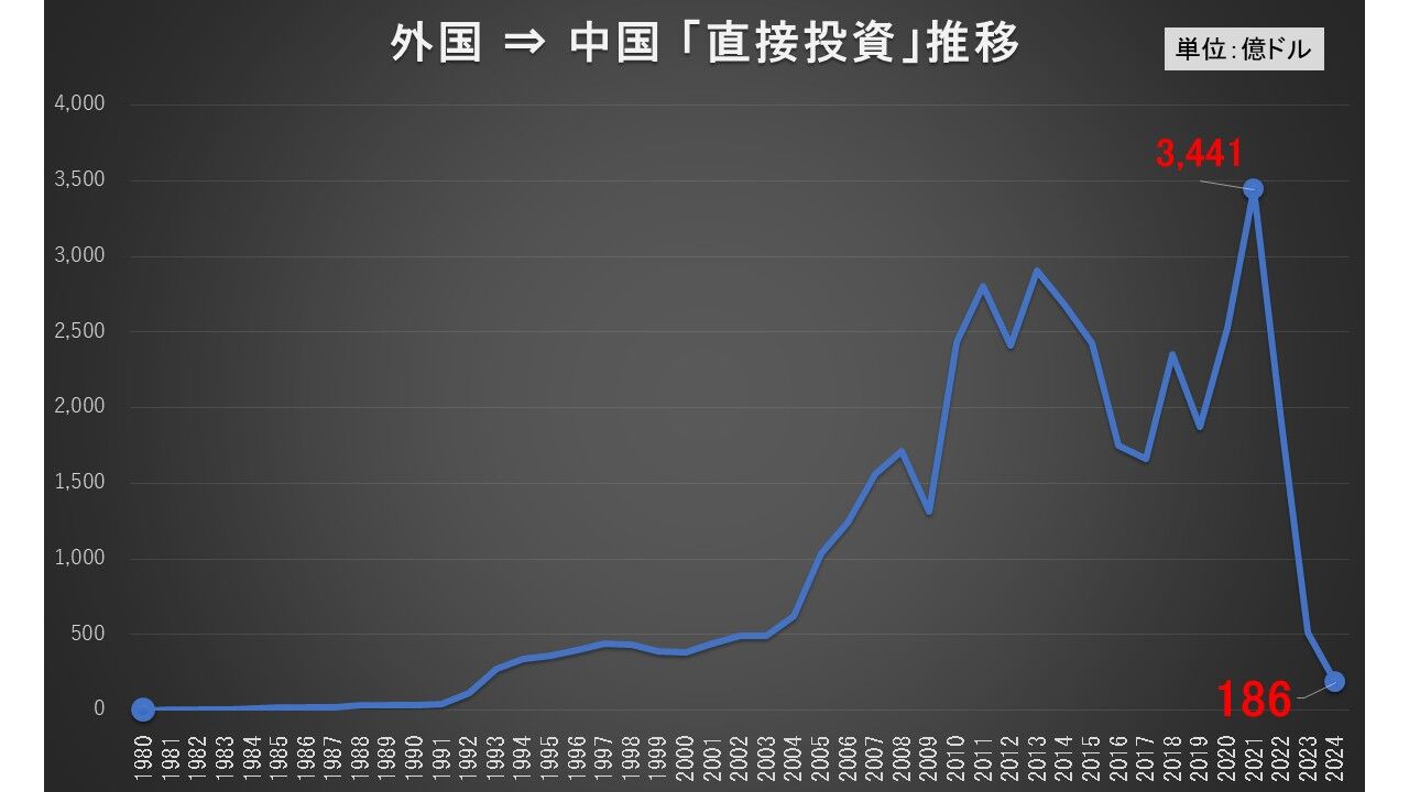 コロナ禍が明け、「中国がリオープニングするぞ」という期待で盛り上がった2021年には、中国への直接投資は「3,441億ドル」もあったのに、2024年はたったの「186億ドル」まで減少しています。