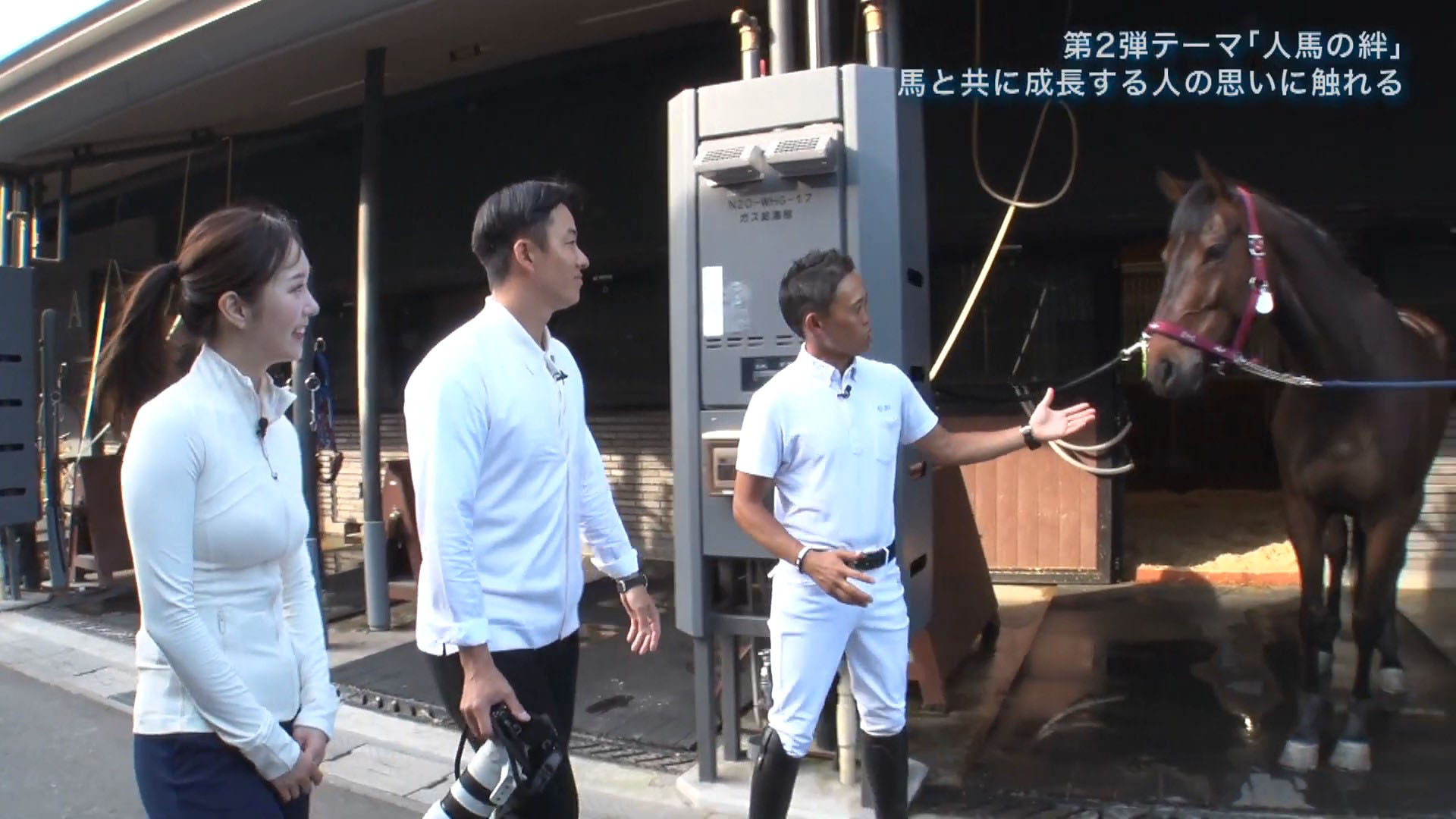 北海道の馬産地をレポートした刈川くるみアナがピタピタの乗馬用スーツを着て巨乳の形がくっきりと浮き出ていました! ノースリーブのニットでは脇全開ポーズも! GIF動画付きで! [2025年7月20日 続・人馬一生]