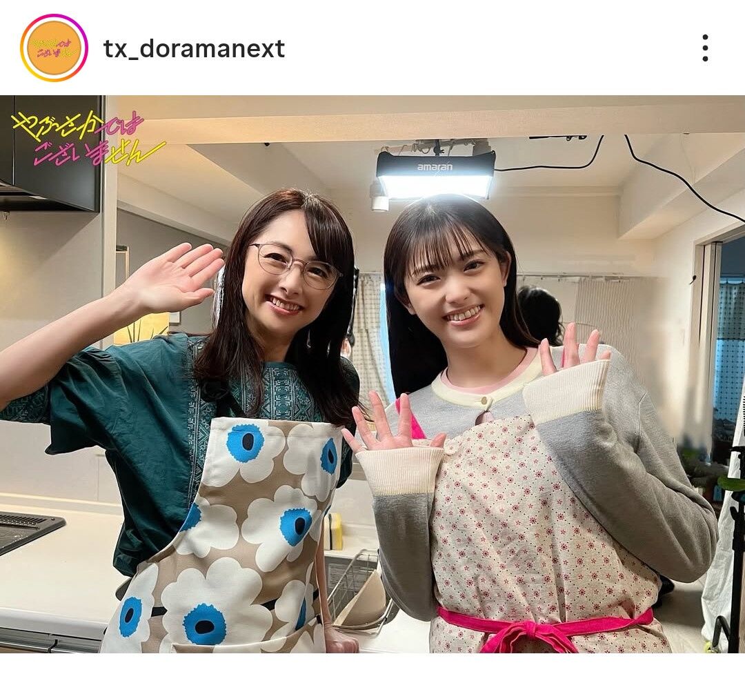 松村沙友理がドラマ『やぶさかではございません』のオフショットを公開。母親役とのエプロン姿に「美人母娘」との声。