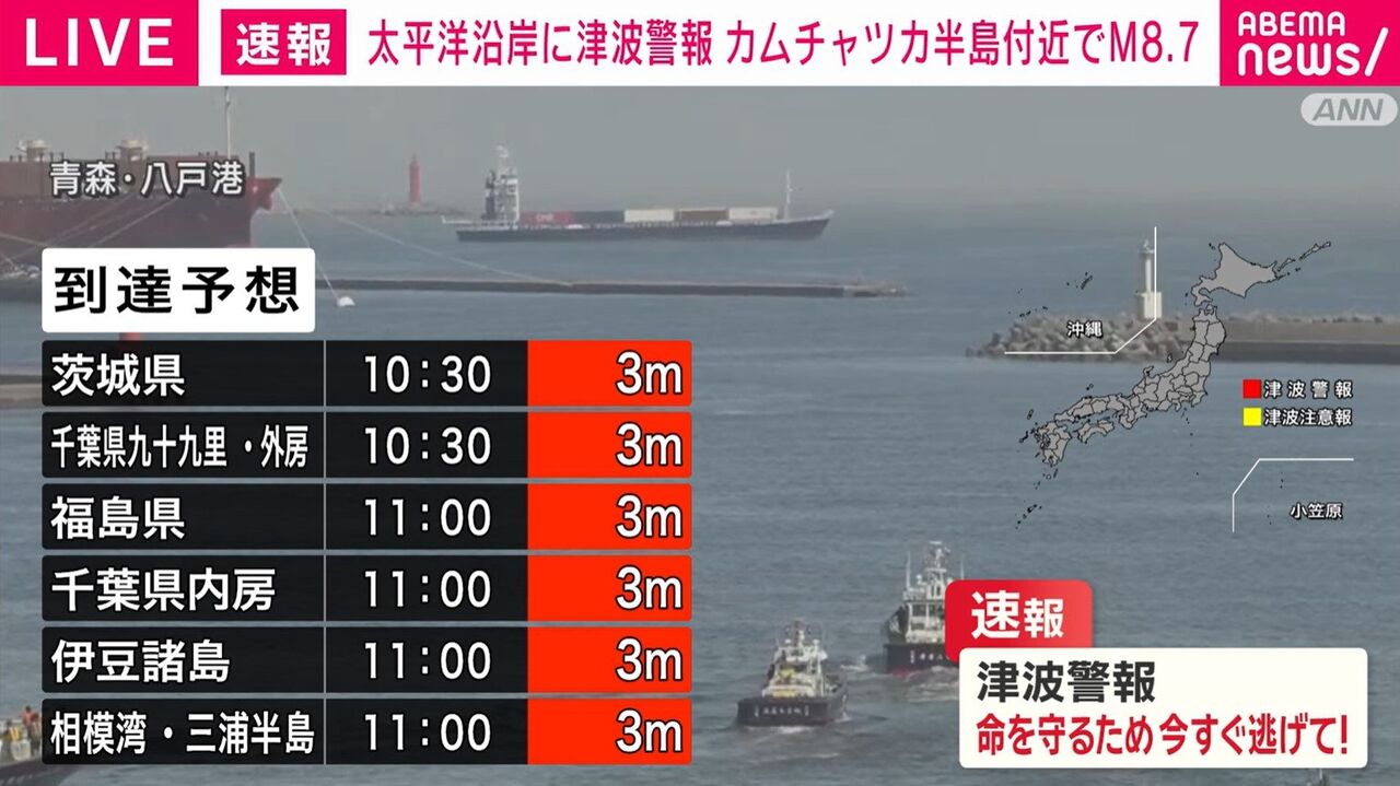 [速報] 「カムチャッカ地震の影響で韓国・北朝鮮沿岸に0.3メートル未満の津波予測」