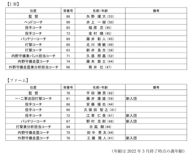また平田勝男監督が率いる2軍は、江草仁貴氏が投手コーチ、野村克則氏がバッテリー、工藤隆人氏が外野守備走塁コーチに就任した。計19人のスタッフで2005年以来、17年ぶりのリーグ制覇、そして1985年以来の日本一を目指す。