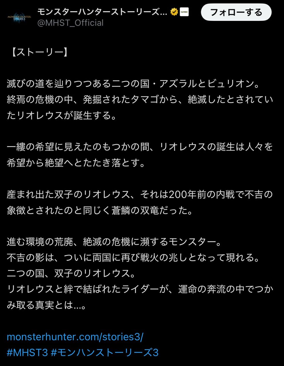 モンハン最新作「発掘されたタマゴから、絶滅したとされていたリオレウスが誕生する」