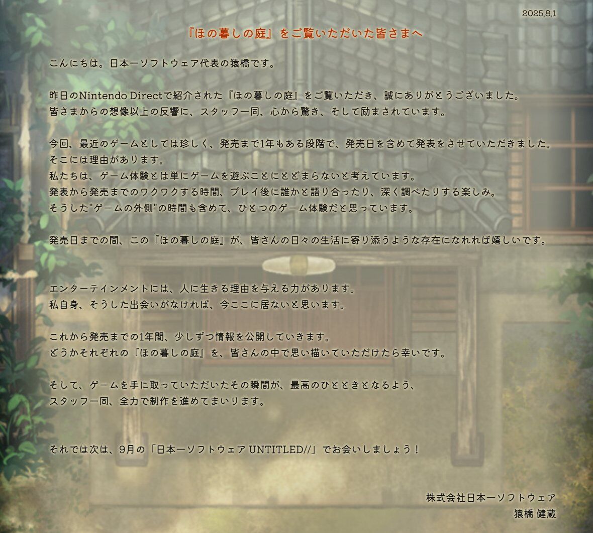 『#ほの暮しの庭』をご覧いただいた皆さまへ pic.twitter.com/q5wji3oEr1 — ほの暮しの庭 公式 (@Honogurashi) August 1, 2025