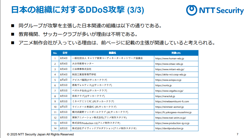 NTTグループでセキュリティ事業を手掛けるNTTセキュリティ・ジャパンは8月7日、日本の教育機関やサッカークラブ、アニメ制作スタジオへのDDoS攻撃を主張するクルド人ハッカー集団の動向をまとめたレポート資料「クルド人グループによる日本の組織を狙ったサイバー攻撃」を公開した。同集団によるXやTelegram上での主張や、その動機・素性に関する見解をまとめている。