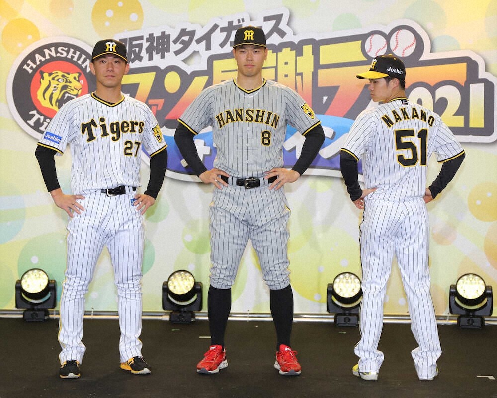 阪神が2022年に着用する新ユニホームを「ファン感謝デー2021オンライン」内で発表した。ホーム、ビジターともに一新。ホームは「伝統の縦縞」とチームカラーの「イエロー」を継続し、ストライプの仕様をスリムなものに変更、ビジターは球団初の「グレー×ストライプ×イエロー」が採用された。この日はホームを伊藤将、中野、ビジターを佐藤輝が着用して登場。ビジターユニホームはメジャーリーグのパドレスを彷彿とさせるカラーリングとなった。