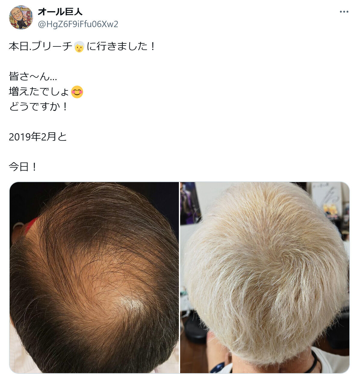 巨人は「本日、ブリーチに行きました!」と報告。そして頭頂部がかなり薄い19年の黒髪の頭髪写真と、ブリーチに行った後の、白く毛量がフサフサに増えている現在の最新頭髪写真を並べて掲載し「皆さ〜ん… 増えたでしょ どうですか! 2019年2月と 今日!」と笑顔の絵文字を添え、つづった。最新の写真では、6年前にはかなり見えていた頭頂部の皮膚がほとんど見えないほど髪の毛が生えそろっており、見違えるように変わっている。