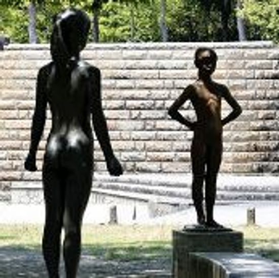 高松市中心部にある市中央公園。約3・5ヘクタールの園内には、市出身の文豪・菊池寛や読売巨人軍の名監督・水原茂氏ら計31体の像などが設置されている。その中には、少女2人が向かい合って立つ裸像もある。