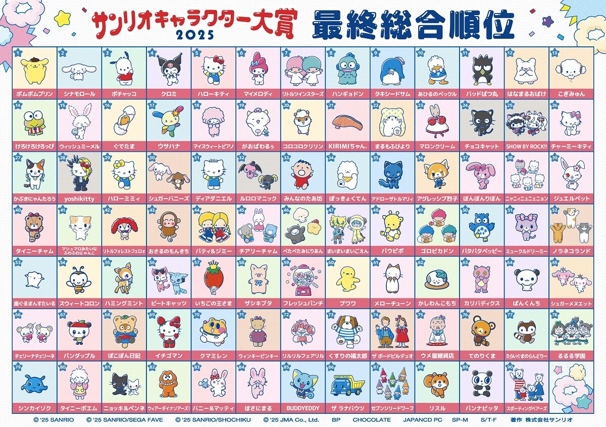 サンリオキャラクターの人気投票イベント『2025年サンリオキャラクター大賞』の最終結果が29日に発表され、ポムポムプリンが9年ぶりに1位に輝きました。