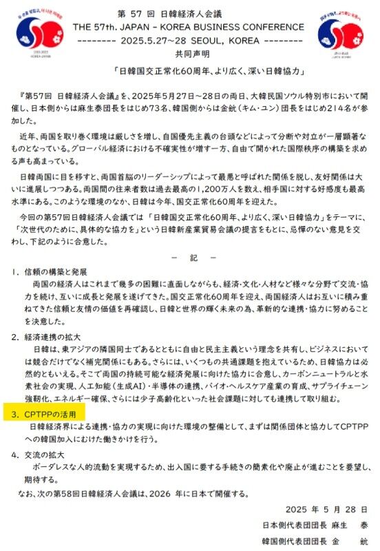 連携に向けたCPTPPへの韓国加入を願い、共同声明に盛り込みました。