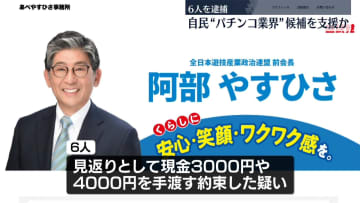 阿部氏はパチンコ店の全国組織「全日本遊技事業協同組合連合会(全日遊連)」の理事長。業界の組織内候補として出馬し、8万8368票を獲得したものの落選した。共同通信などによると、7月20日投開票の参院選で、店舗従業員らに、阿部氏への期日前投票の見返りに、3000円または4000円の報酬を支払う約束をした疑い。捜査当局は、各地の従業員ら約250人に投票を求めたとみているという。