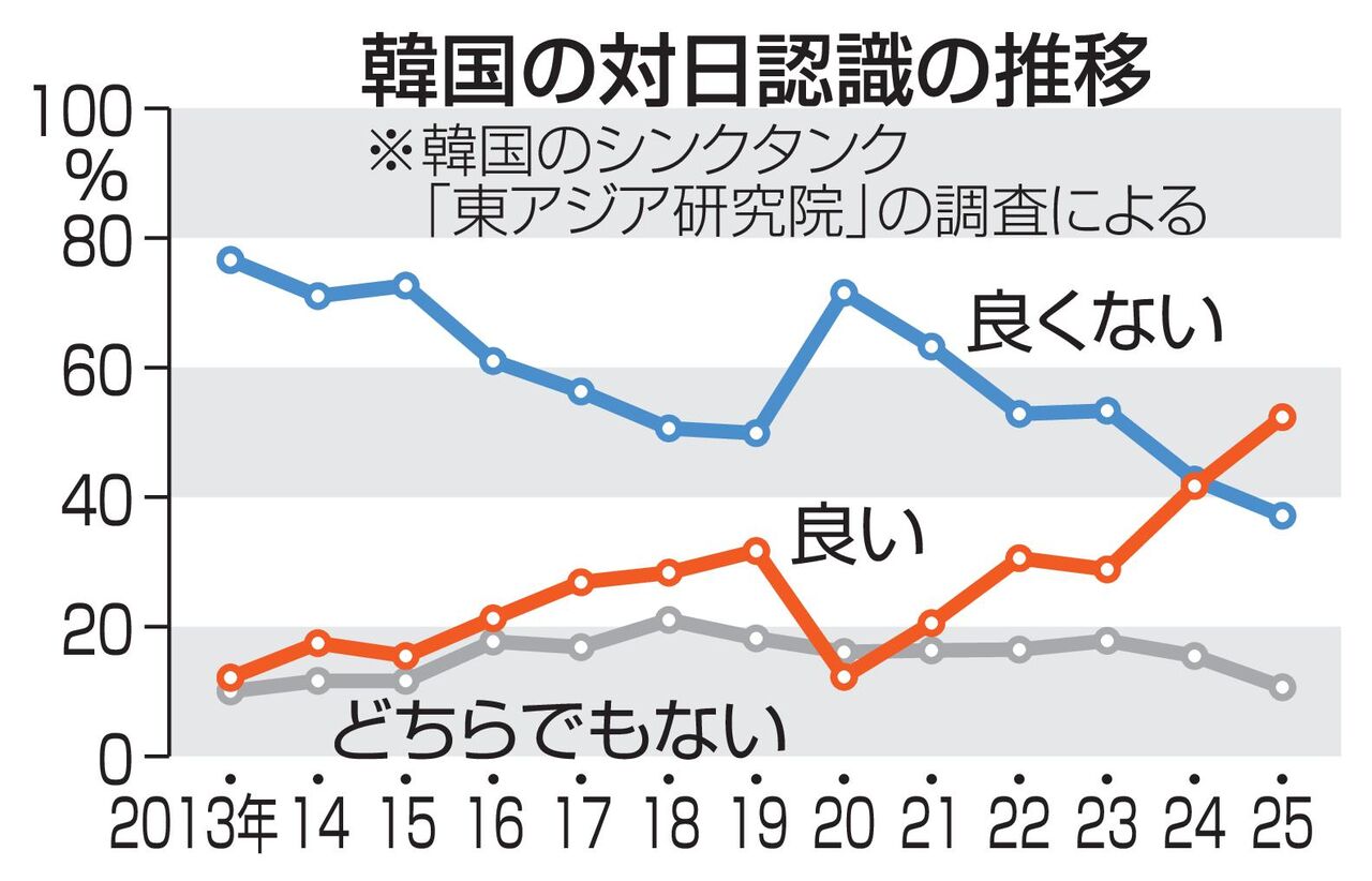 一方、日本に「良い印象」を持つ韓国人は昨年の41.8%から今年52.4%に増加し、過去最高を記録した。日本に「悪い印象」を持つ韓国人は37.1%で過去最低だった。