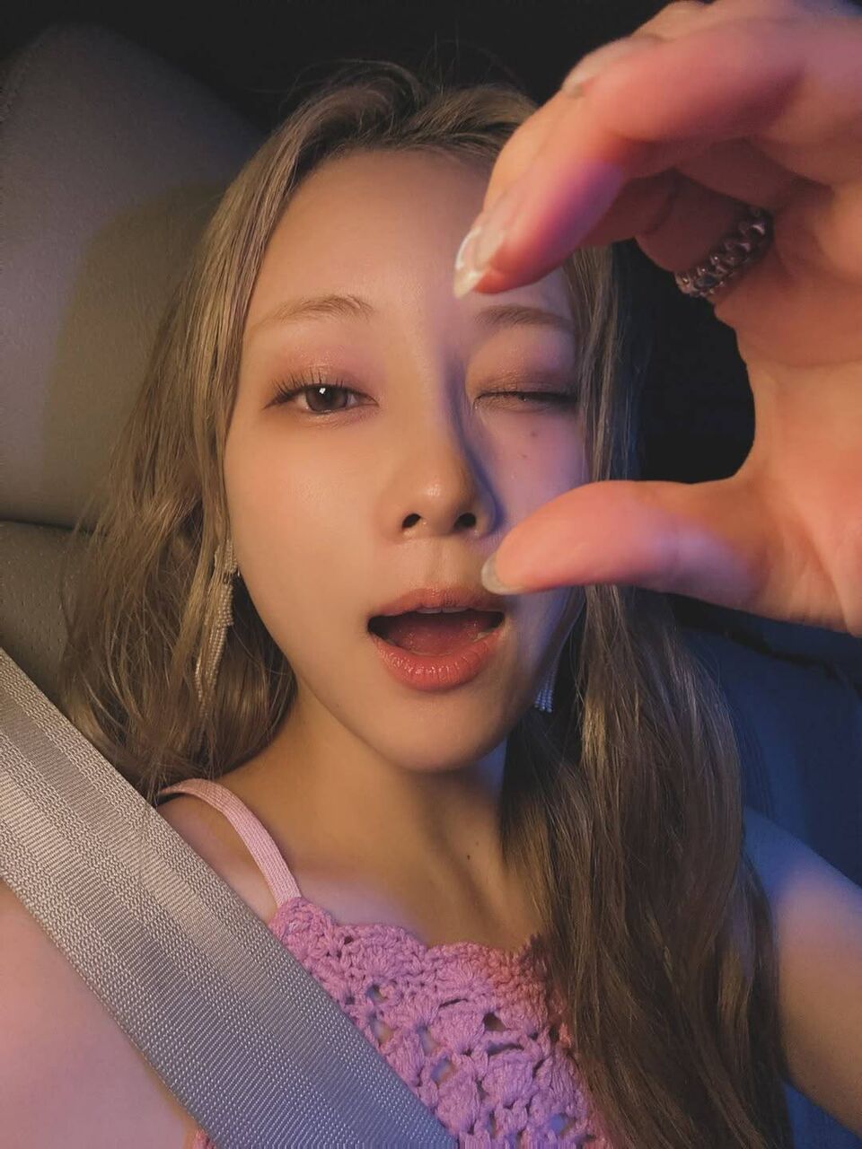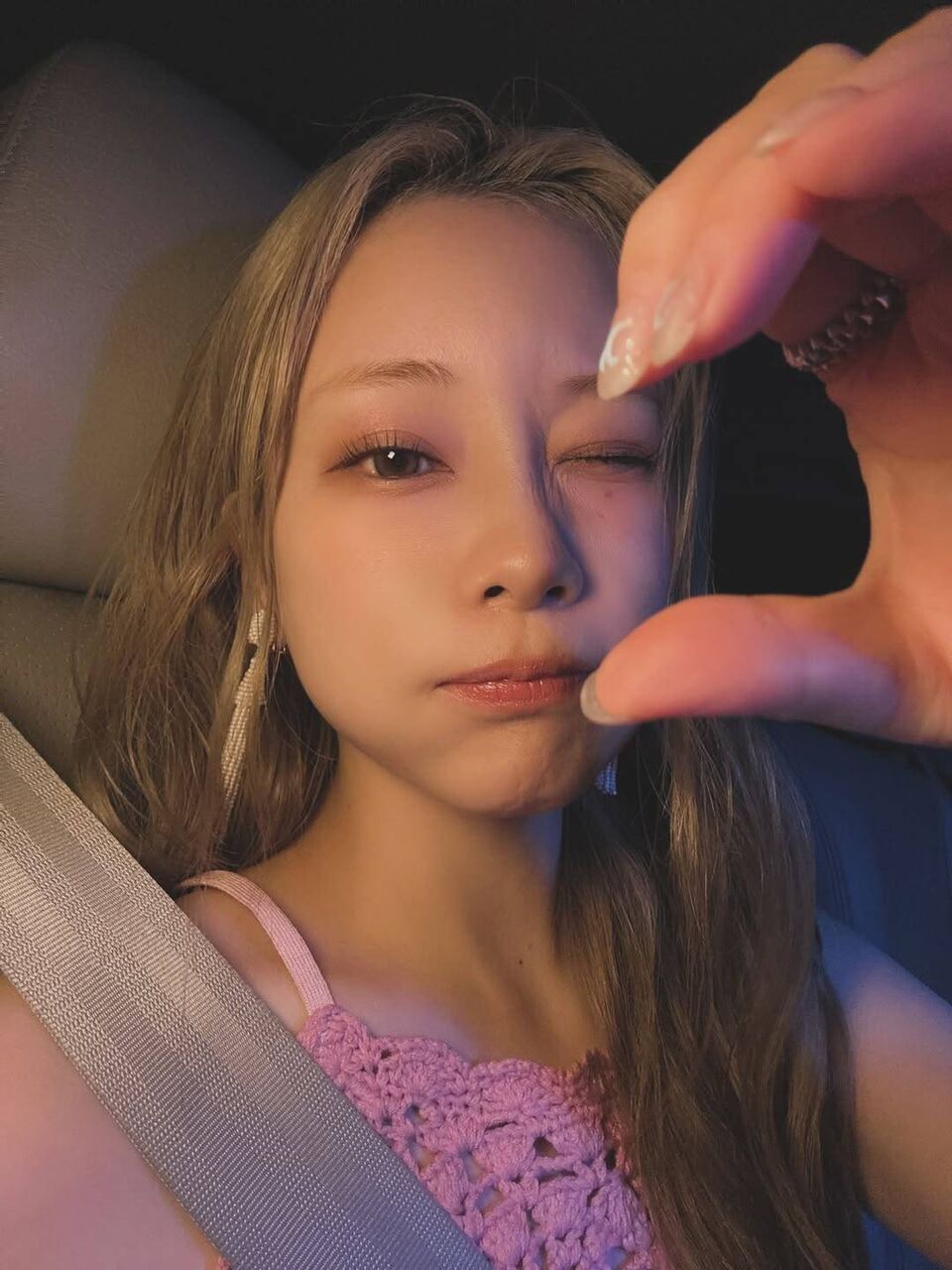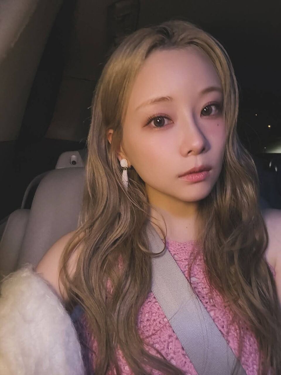 インスタグラムでは、車の中でシートベルトを装着し、ピンクのニットキャミソール姿のショットを複数枚公開。金髪のヘアスタイルでイメージを一変させた。