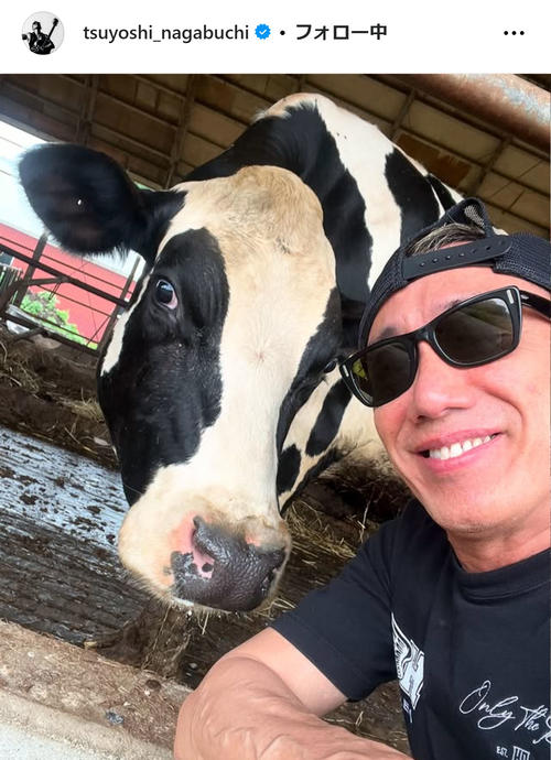 長渕は「なんと瞳のかわいいこと。お目々がなんでそんなにでっかいの? まつげがなぜそんなにながいの? 若い女の子が見たら嫉妬しちゃうね。もぐもぐもぐもぐ干し草を おいしそうに食べるんだね」とつづり、牛とのツーショットを公開した。