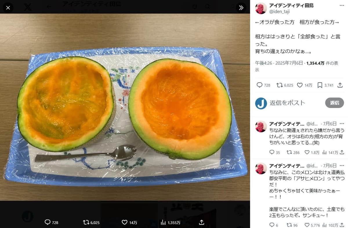 メロンの食べ方で見える育ちの違いについて、芸人「アイデンティティ」の田島直弥が投稿し反響を呼ぶ。