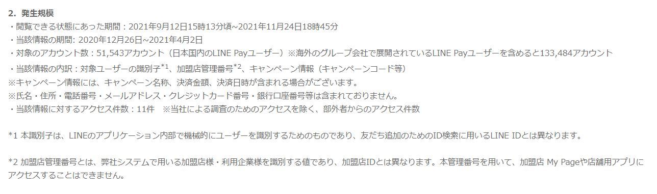 漏えいした情報は、2020年12月26日~21年4月2日分の、対象ユーザーの識別子、加盟店管理番号、キャンペーン情報。キャンペーンコードの他、キャンペーン名称、決済金額、決済日時なども含まれる可能性があるとしている。対象のユーザー数は、日本国内5万1543人分。海外のグループ会社が展開しているLINE Payユーザーも含めると13万3483人分にも及ぶ。