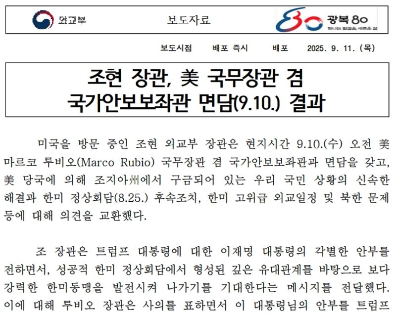 これに対し、ルビオ長官は、トランプ大統領としても李大統領と導き出した米韓首脳会談の成果を高く評価しており、当該事案に対する韓国民の敏感性を理解し、特に合衆国経済・製造業復興のための韓国の投資と役割について前向きに見ていると述べた。
