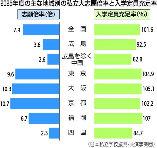 なぜか。広島の私立大がまず挙げるのが関西の私立大の影響だ。広島のある入試担当者は「関西はなりふりかまわず、合格を出す。大都会に憧れる広島の受験生をごっそり取っていく」と嘆く。
