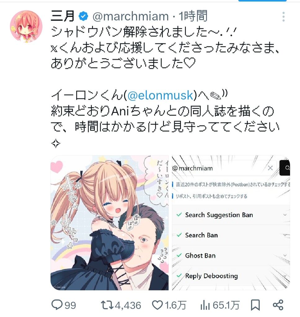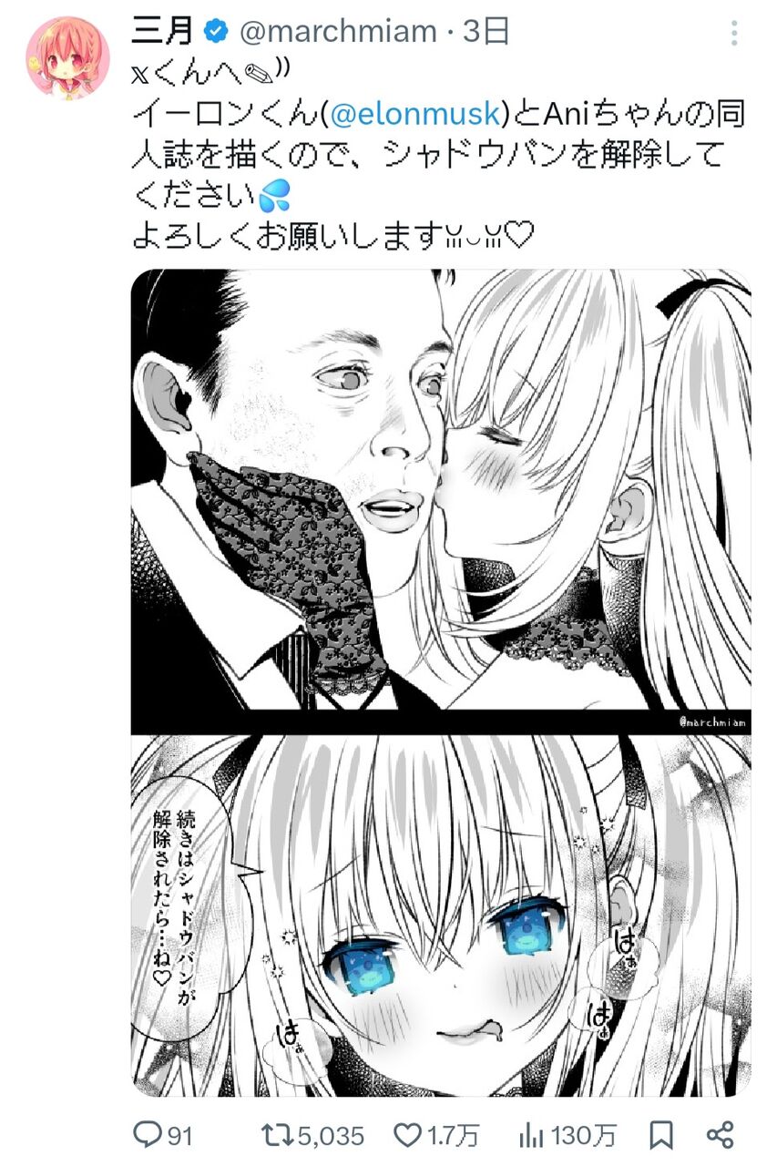 ひなこのーと作者「BAN解除してくれたらイーロン×Aniの同人誌書きます♥」→解除される