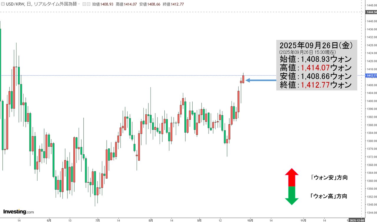 2025年09月26日15:30時点で「1ドル=1,412ウォン」となりました。