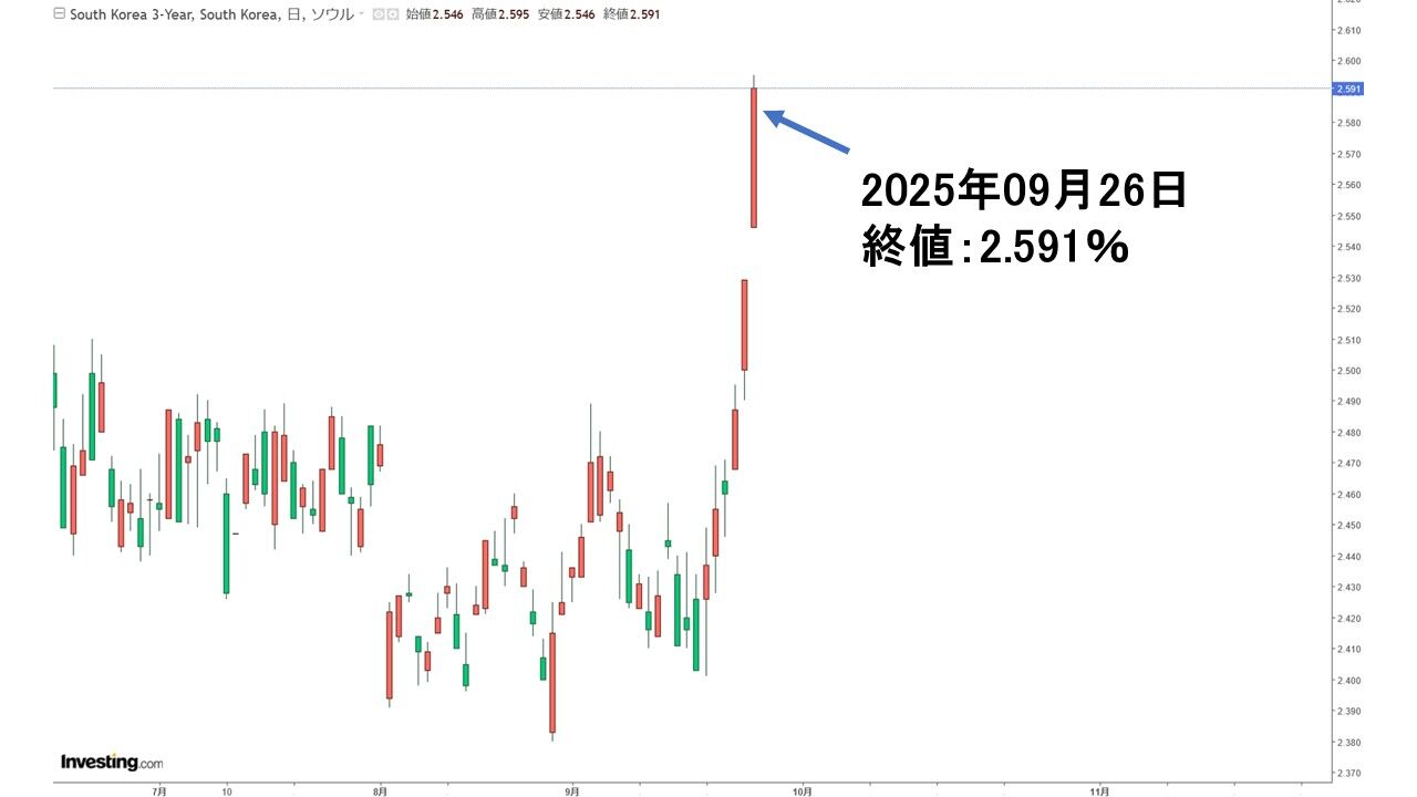利回りが上がるということは、韓国の国債価格が下がっていることを意味します。