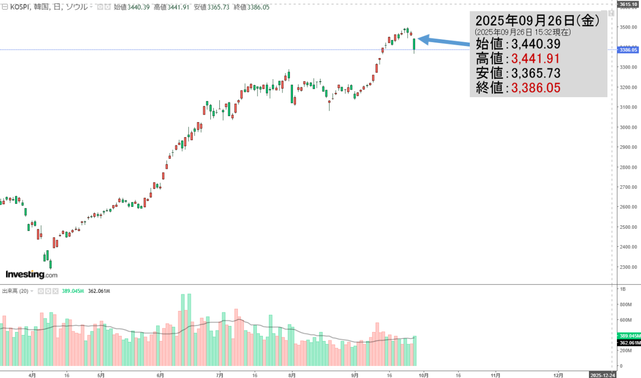 「わがKOSPIは新しい国への高い希望と期待感を足場として連日で最高値を更新している」のKOSPIは、以下のとおりギャップダウンから始まって陰線を伸ばし、「3,386」まで急降下。