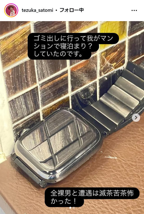 一方で「そして、これからはどんな時でも肌身離さず携帯電話は持っていようと! ゴミ出しの時も! どんな時でも!」と携帯電話を持ち歩いていなかったわが身への自戒の念も記した。その上で「でも、この投稿 全裸男が見てたらと思うと、、、それも怖い」と重ねて恐怖をつづった。