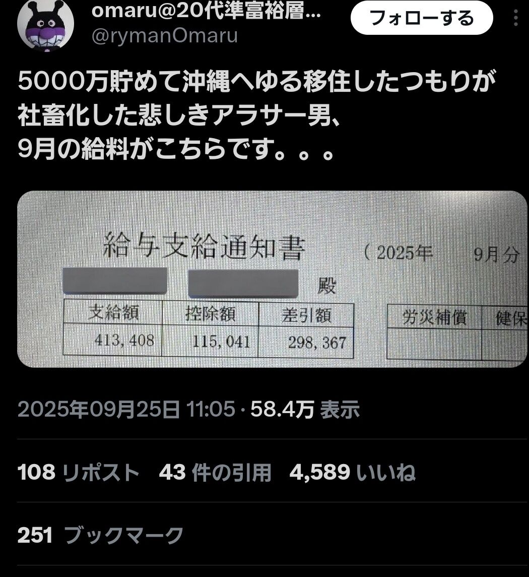 【悲報】20代で5000万円貯めて沖縄移住しFIREした男性、社畜に逆戻りしていた