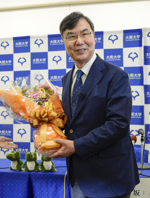 記者会見で花束を手にする坂口志文さん(6日夜、大阪府吹田市で)=須藤菜々子撮影