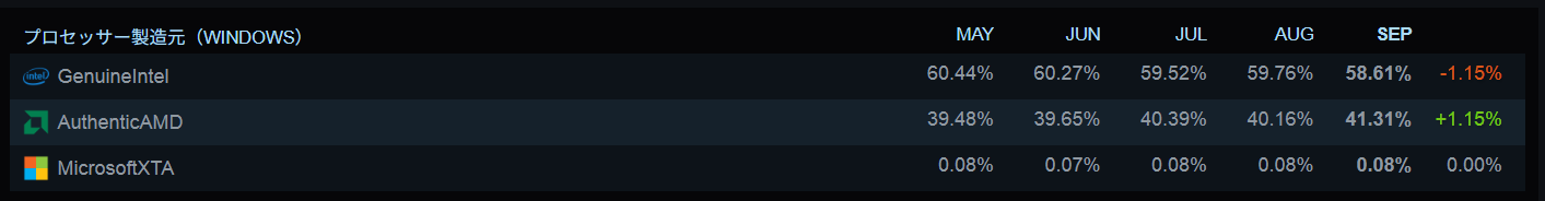 2025年9月に集計されたCPUのシェアは、Intelが前月比1.15%減の58.61%を記録。一方のAMDは前月比1.15%増の41.31%を記録しています。