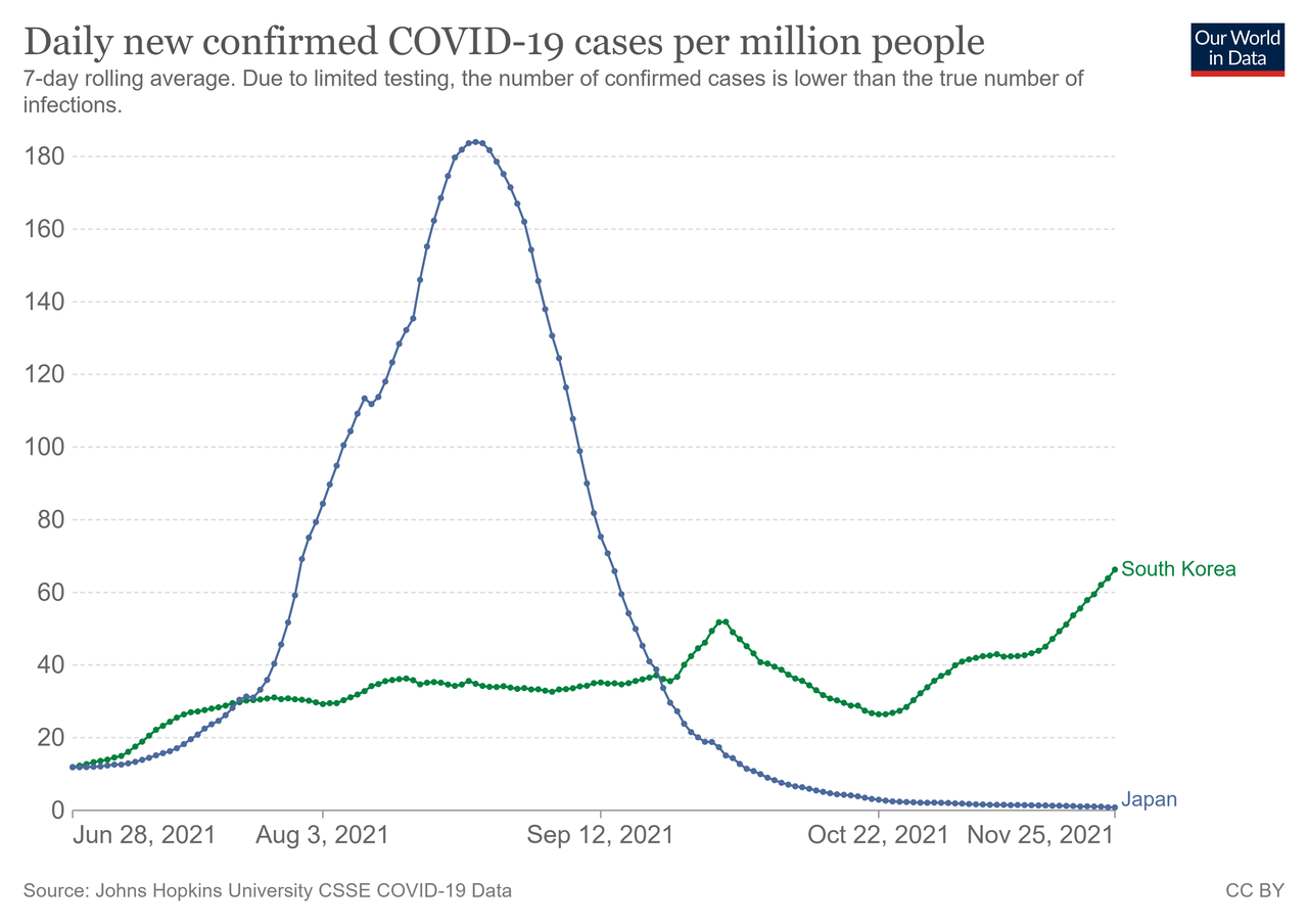 韓国の新型コロナ感染者と重篤・重症患者が急増し危険水準に駆け上がるなかで、ワクチン接種率がほぼ同様の隣国日本は一日の新規感染者が100人台に減るなど安定傾向を維持している。新型コロナ感染者の急減原因をめぐり日本の専門家たちも明確な答を出せず「コロナミステリー」という言葉まで出ている。