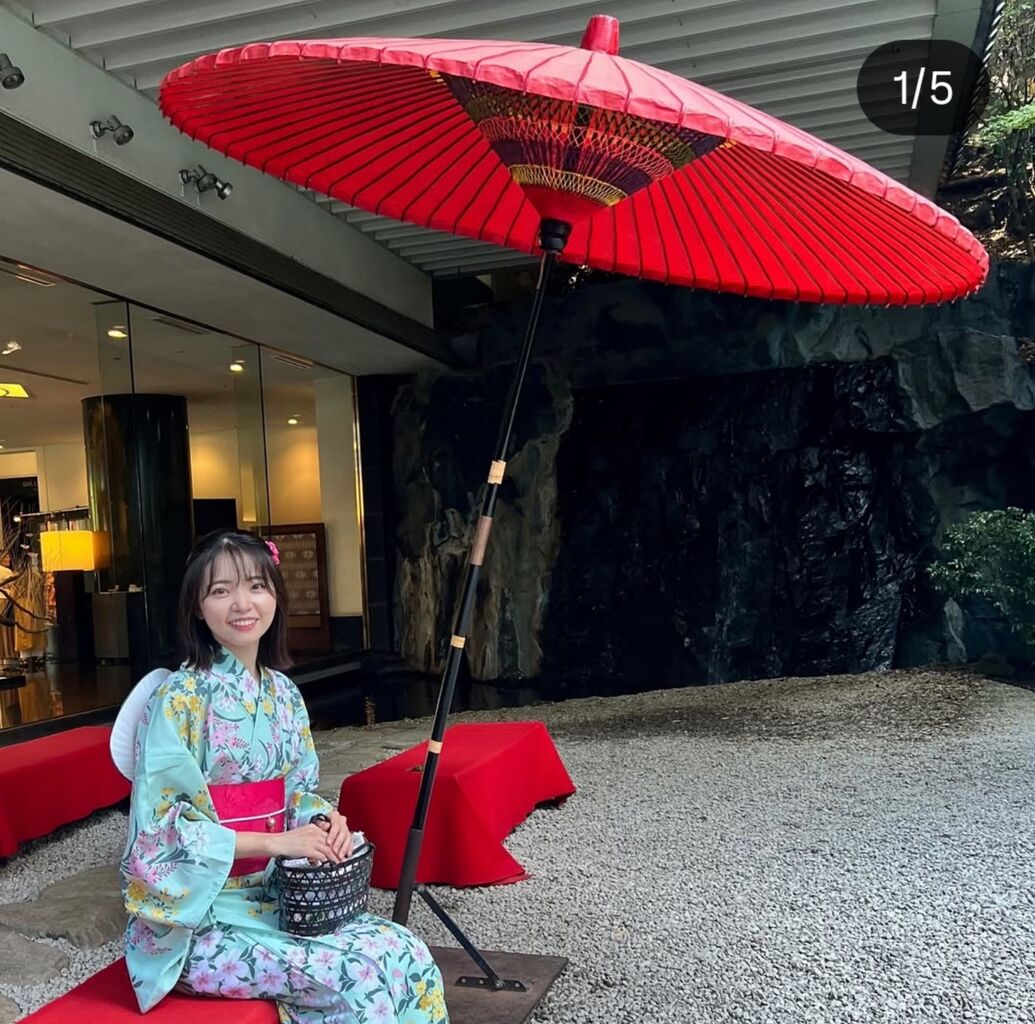 「雅叙園、百段階段。せっかくだから浴衣着ました。」と綴り、自身が写った写真など数枚の写真をアップ。