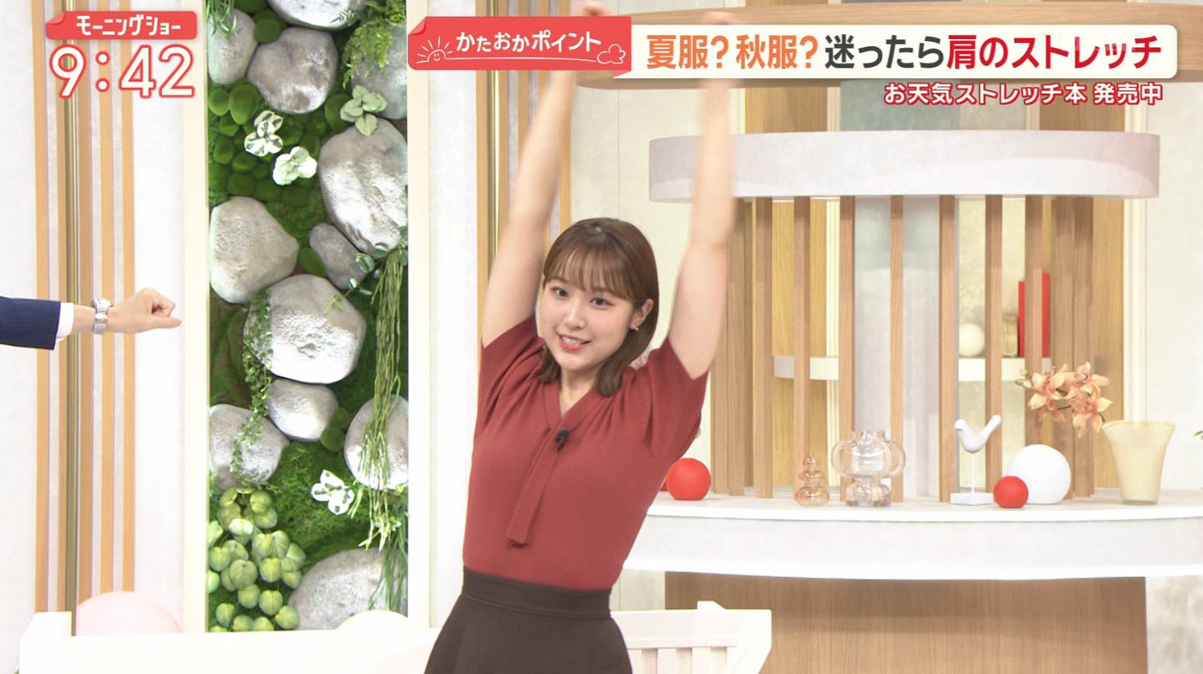 ニットでストレッチをする松岡朱里アナです! [2025年10月6日、3日、2日、1日、9月30日 モーニングショー] 続きを読む