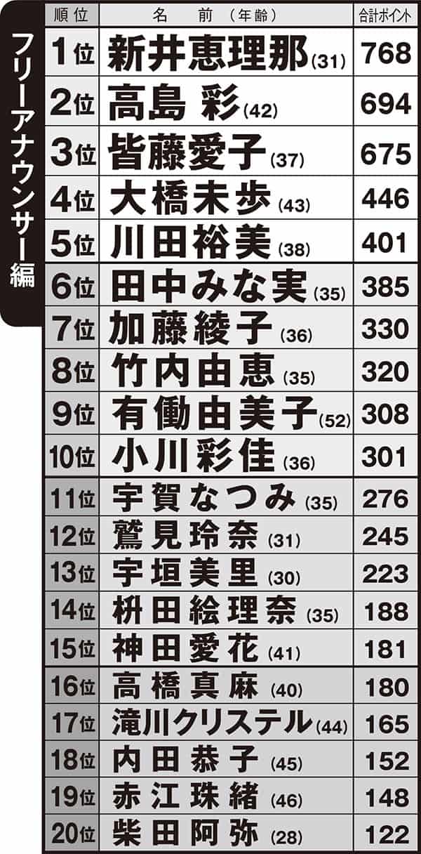 1位に輝いたのは、驚異の768ポイントを獲得した新井恵理那。「愛鳥のボタンインコが死んだとき、インスタで号泣していた」「番組で使うポップを自分で一生懸命作るほどの凝り性」「キー局の就職試験全敗の悔しさからか、現場では人一倍の頑張り屋さんで、腰も低くスタッフ受けも抜群」と、「いい人」エピソードは豊富だ。