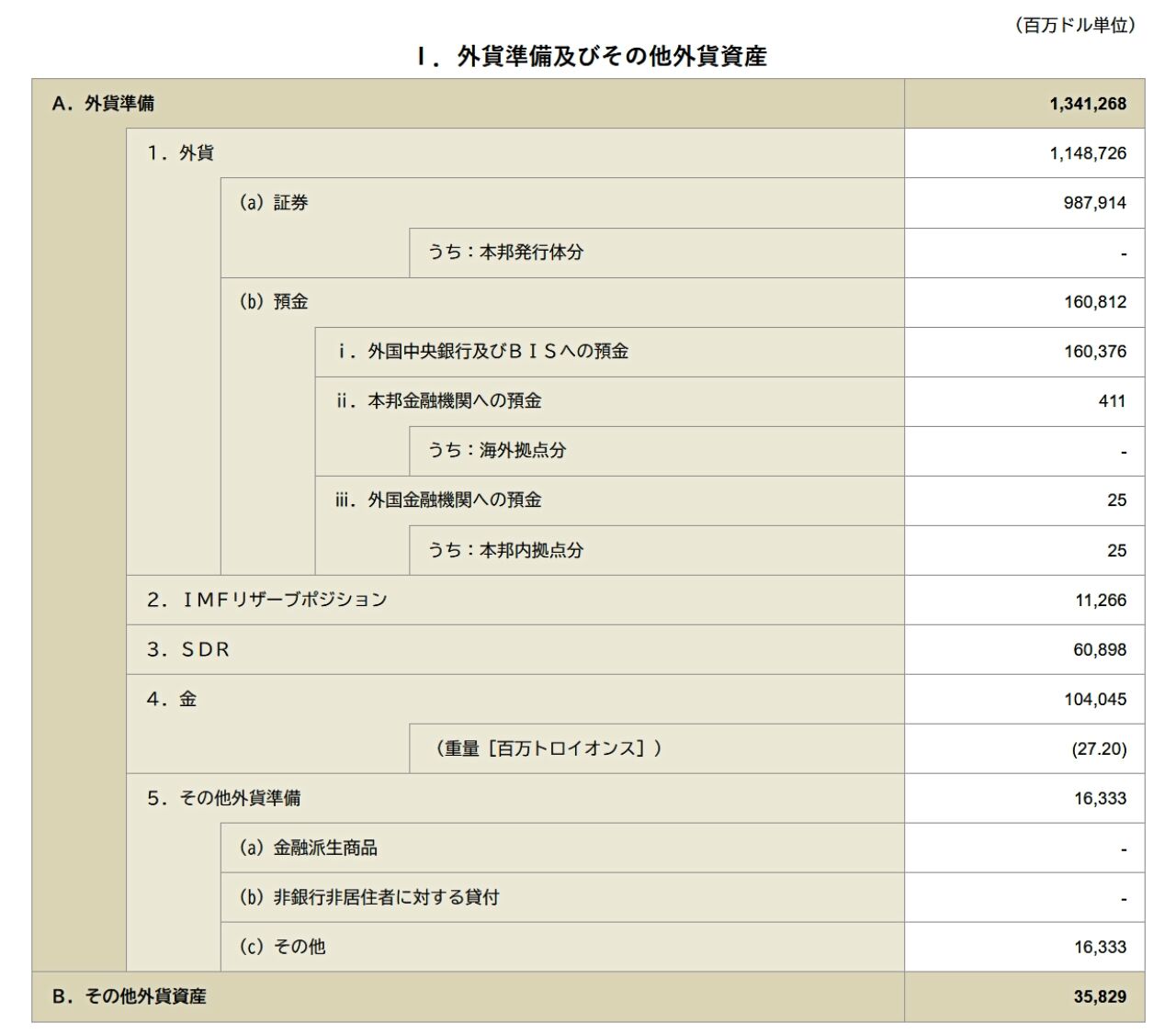 対して日本の外貨準備高は上掲のとおり、同じく2025年09月末時点で「1兆3,412億6,800万ドル」あります。