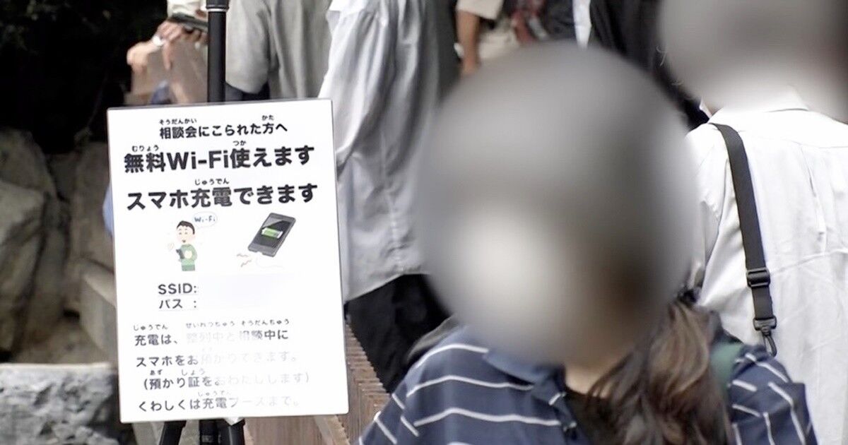 炊き出し会場に掲げられた「無料Wi-Fi使えます」