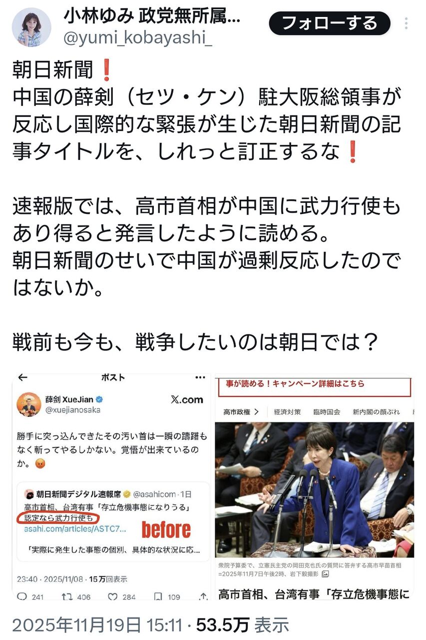 中国の薛剣氏、朝日新聞のミスリードのせいで「高市首相の首を斬ってやる」投稿した可能性
