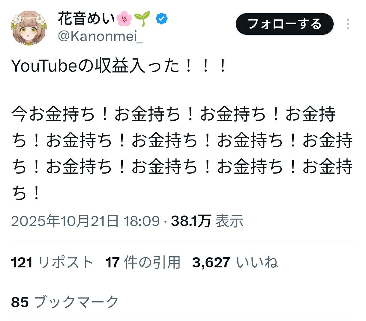【画像】Vtuberさん、YouTubeの収益が入って大歓喜wwwwwwwwwwww