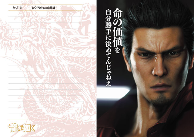 処方箋シールを貼るノート部分には各キャラクターの刺青や、桐生一馬の「命の価値を、自分勝手に決めてんじゃねえ」など各キャラクターの名言もデザインされています。
