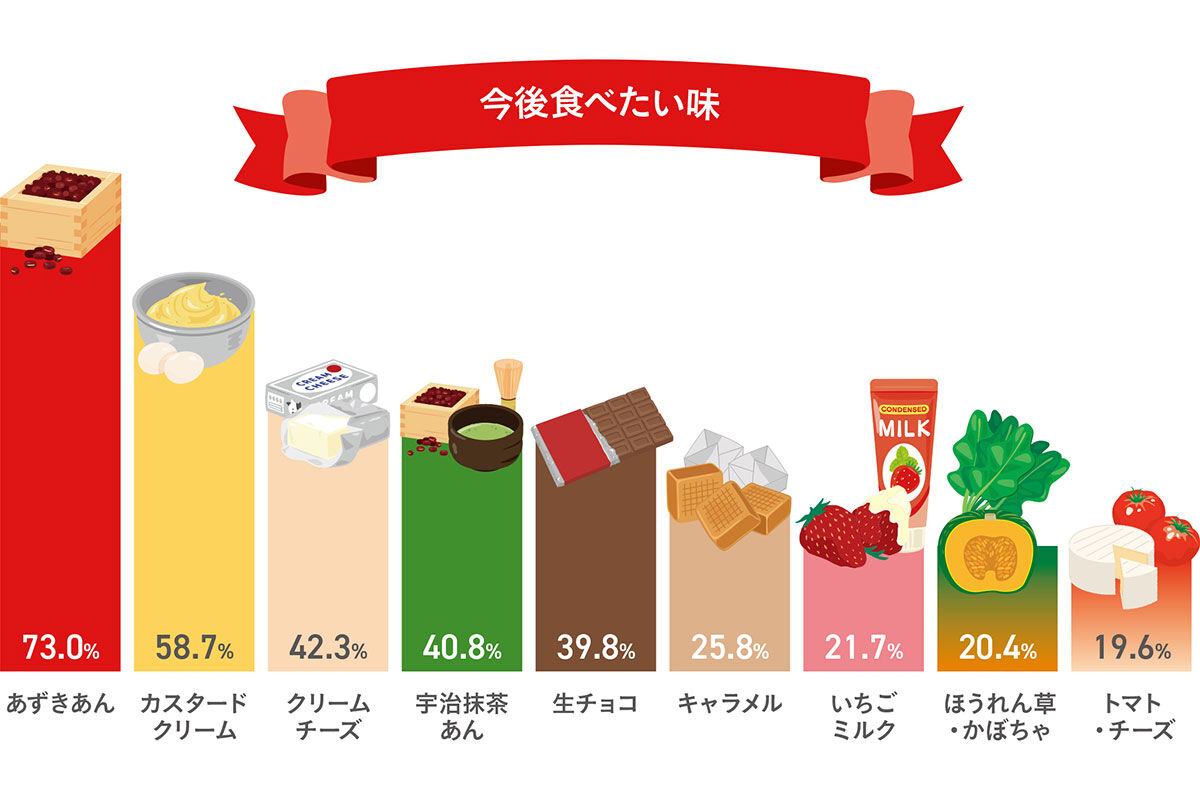 同社の調査では、今後食べたい味として「あずきあん(73.0%)」がダントツの1位に。