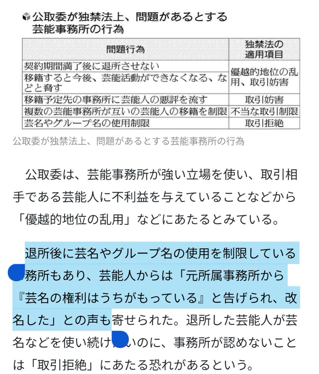 公取委が芸能人と事務所契約について指針を発表。移籍後の芸名使用制限や活動妨害は違法の可能性がある。