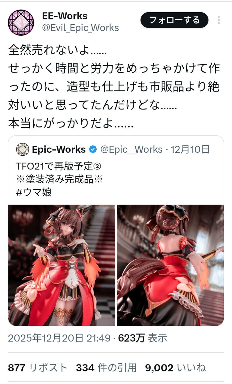 個人フィギュア製作者さん「クオリティ高い市販品よりもいいの作ったのに全然売れない…がっかりだよ😭」