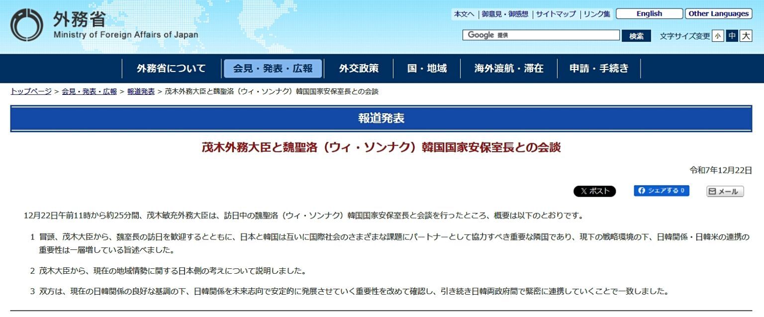 ⇒参照・引用元:『日本国 外務省』公式サイト「茂木外務大臣と魏聖洛(ウィ・ソンナク)韓国国家安保室長との会談」