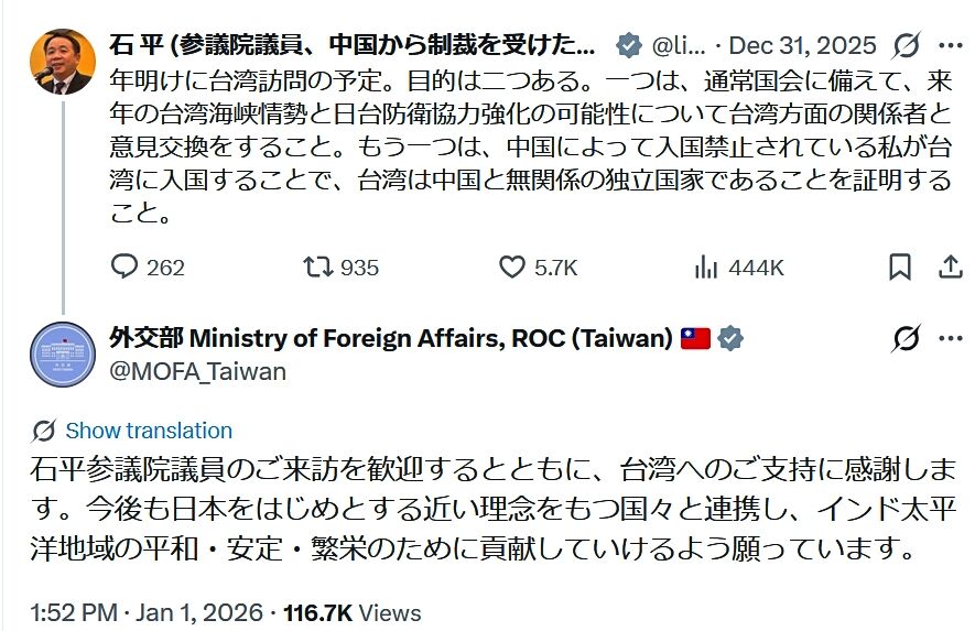 もっとも、台湾の外交部は以下のように、石平さんの訪台を歓迎する投稿を以下のように行っています。