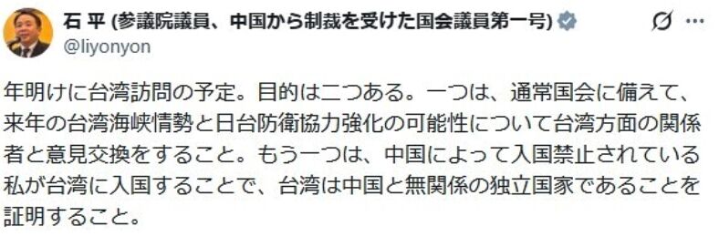 日本の参議院議員・石平氏が台湾訪問を計画しており、自身は中国から入国禁止されていると述べ、
