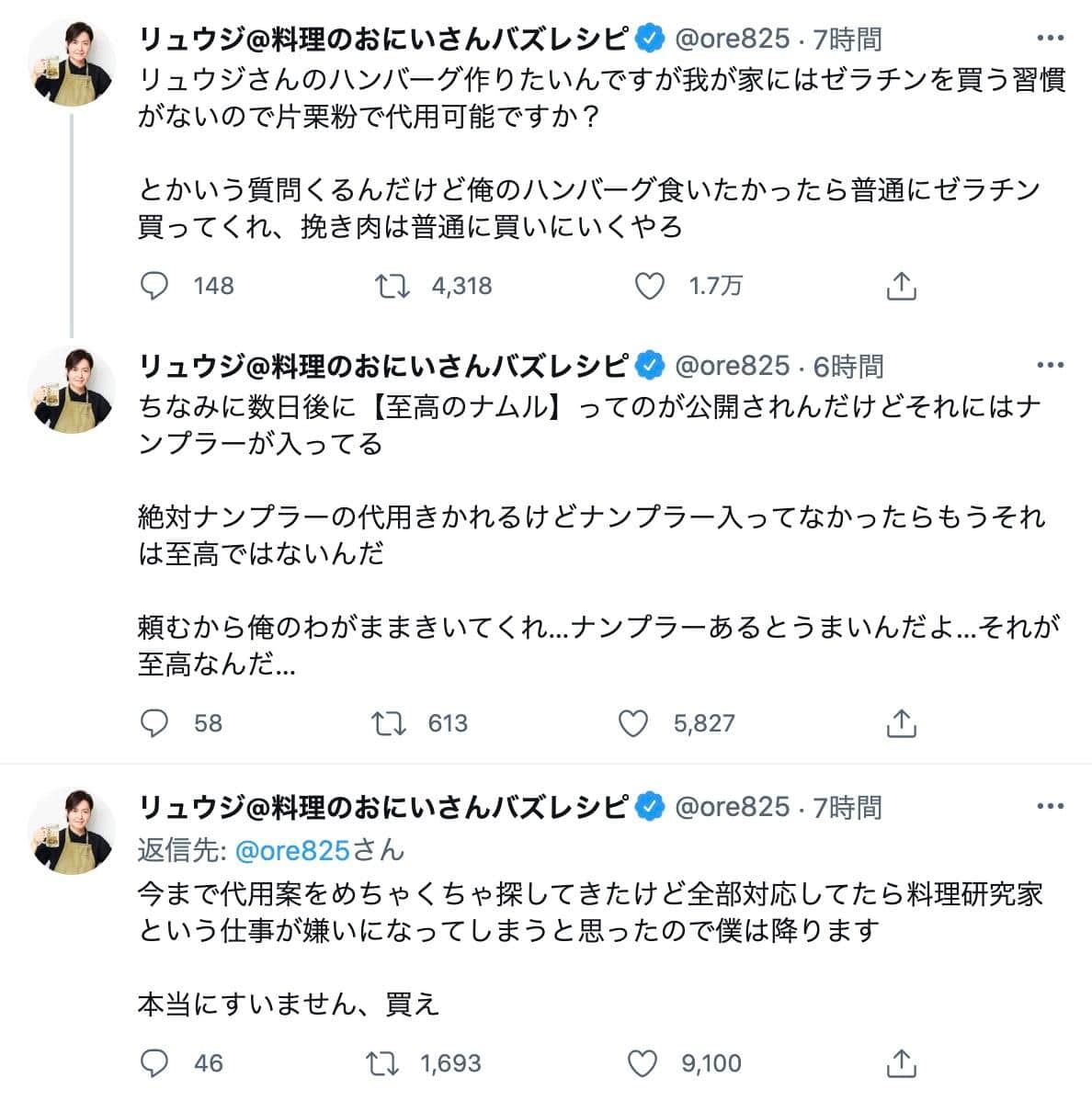 今後は対応をやめるとして「本当にすいません、買え」と訴えた。ネット上では、リュウジさんの発言に賛同するような反応が広がっている。
