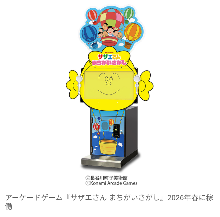 アーケードゲームは1969年の放送スタートから57年の歴史の中で初となり、アミューズメント施設向け間違い探しゲーム『サザエさん まちがいさがし』として、2026年春より稼働する。