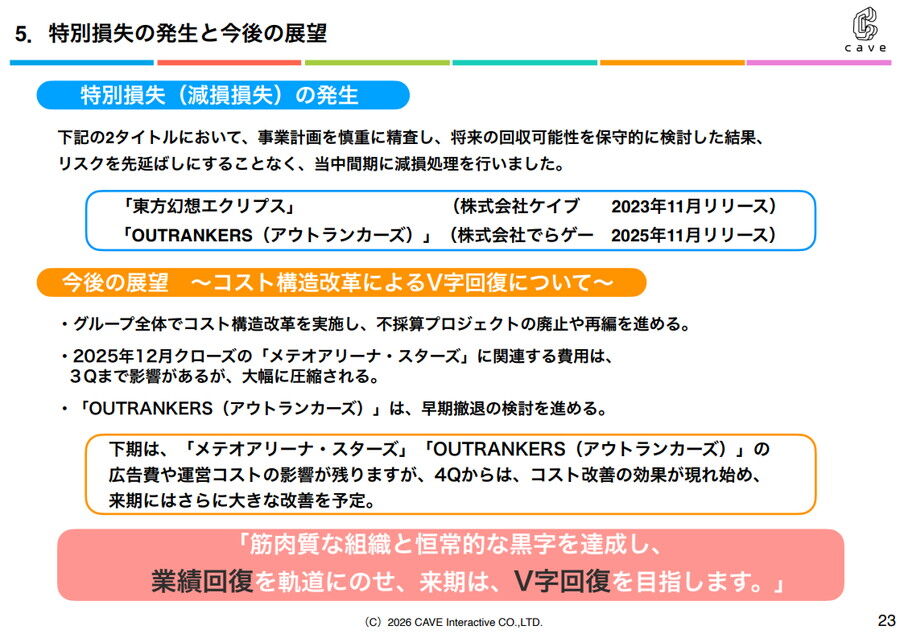 ケイブは、同タイトルの運営成績が想定に達せず、想定期間内での回収が困難であると判断し、ソフトウエア仮勘定において減損損失23億9900万円を特別損失として計上する、としていた。