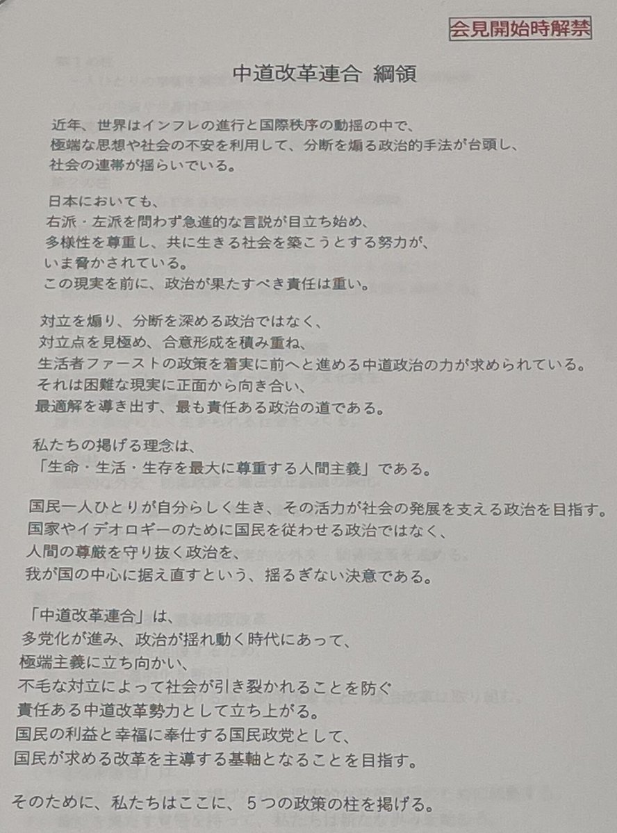 立憲民主、公明両党は19日の記者会見で新党「中道改革連合」の綱領を発表した。「生活者ファースト」などを掲げた。