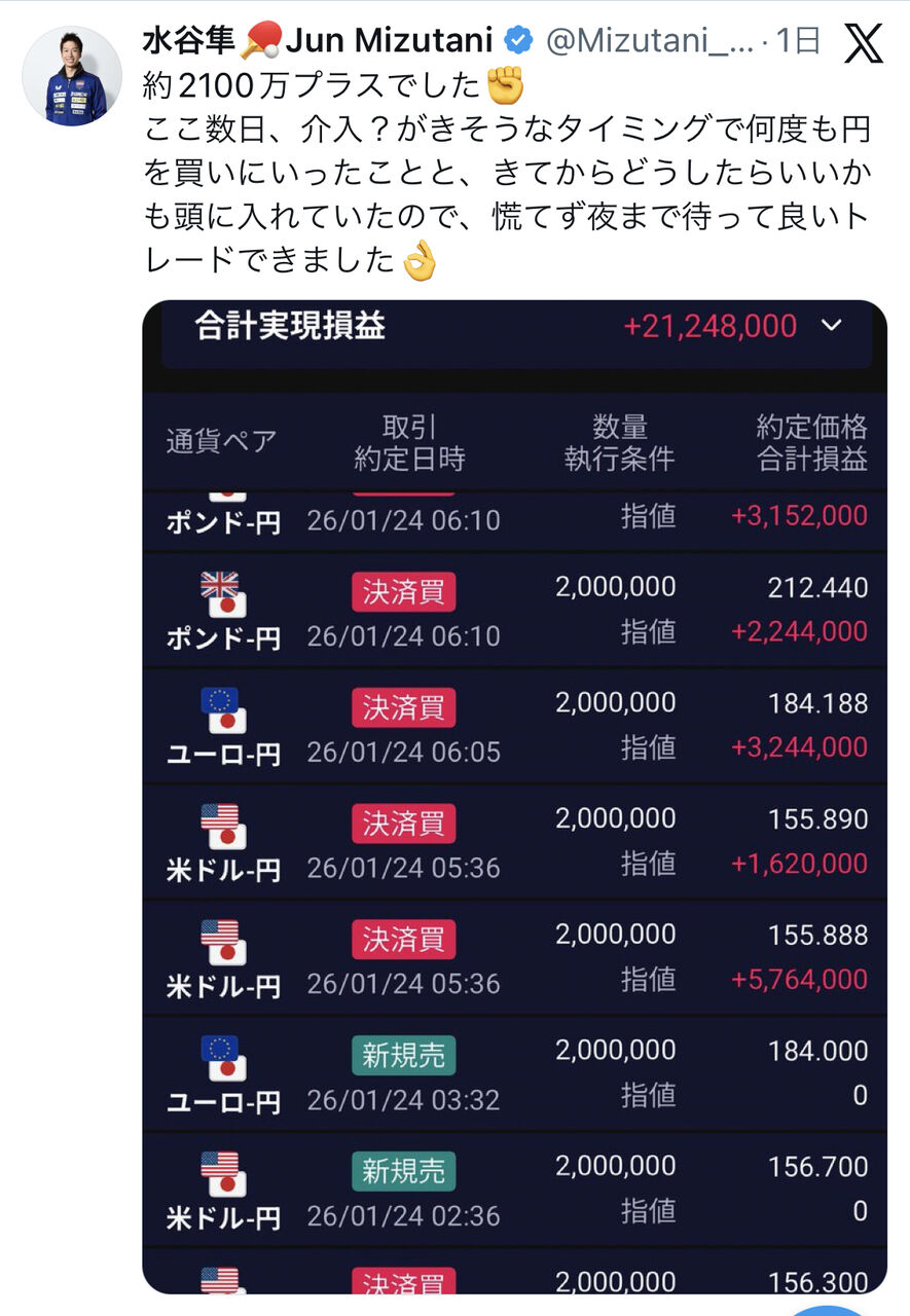 【朗報】水谷隼さん、2100万円のFXでの利益をXで報告してしまうwww