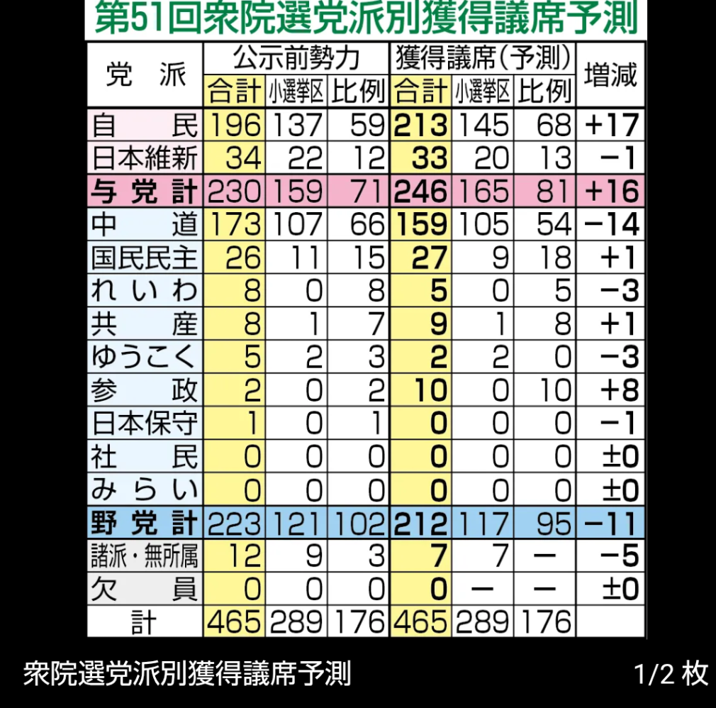 公明党と26年に及ぶ連立を解消した自民党は現有196議席から213議席と伸ばし、連立を組む日本維新の会の33議席と合わせ、16議席増の246議席とした。高市早苗首相(64)は過半数(233)を下回った場合は退陣すると明言しているが「クリアする可能性は高い」と指摘した。立憲民主党と公明党は新党「中道改革連合」を結成したが、14議席減の159議席にとどまるとの見通しを示した。